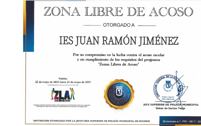 El IES JRJ despues de una año de formación por parte de Policía Municipal de Madrid, en las aulas, al profesorado y equipo directivo, a ... [leer más]