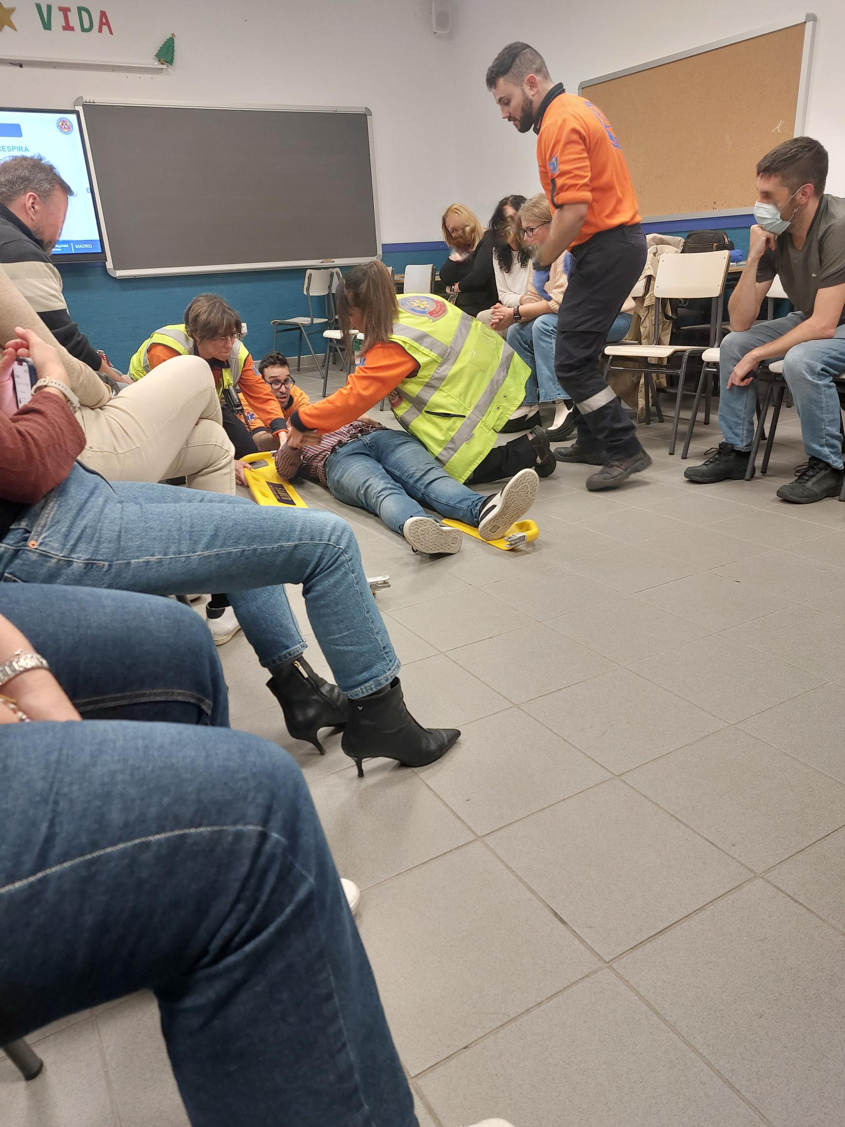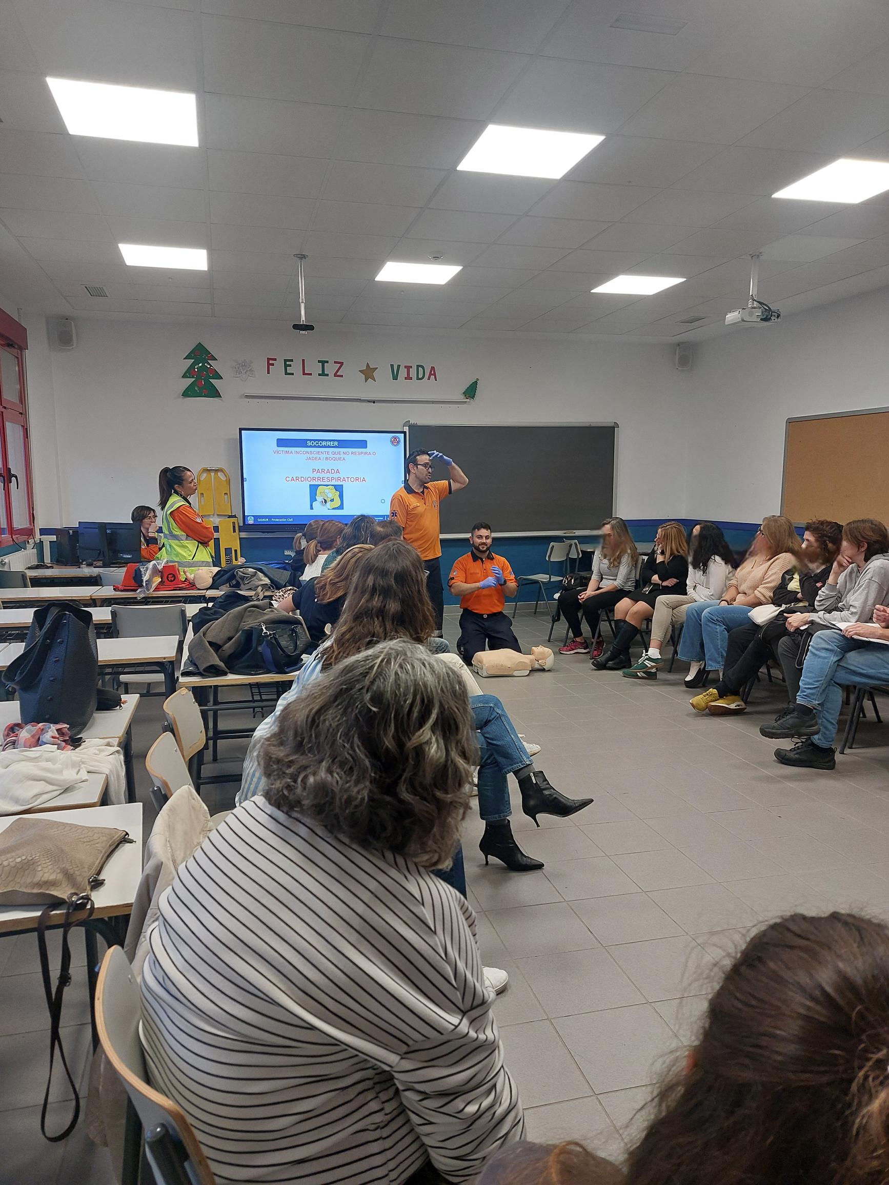 Hoy hemos tenido en nuestro aula magna del instituto JRJ, de nuevo a Oscar ( exprofesor del instituto) y su equipo de voluntarios, que como en ocasiones anteriores nos brindan con su ponencia en el Taller de Primer Respondiente por los voluntarios de SAMUR- PROTECCIÓN CIVIL.
